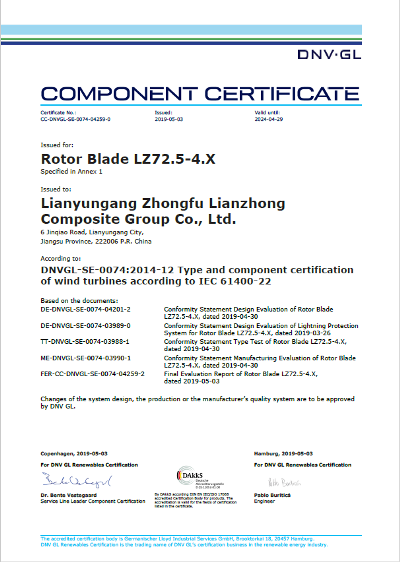 近日,中復連眾收到了DNV GL德國總部發布的LZ72.5-4.X風電葉片型式認證A證書。該證書是迄今為止DNV GL頒發給國內的首張符合IEC標準的4MW級別部件型式認證證書,這標志著國際權威機構對中復連眾綜合研發實力和制造品質的充分認可。另外該型號也是目前國內獲得DNV GL A型式認證證書中長度最長、功率最高的葉片。