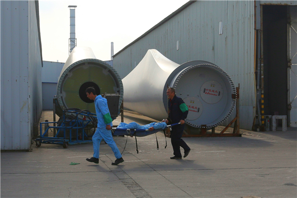 本次演練模擬連云港工廠10#油漆車間因電器隱患發生火災,導致大量物資和人員被困。9點50分,各參演隊伍集結完畢準備演練。10點整,通訊組接報警、報告火情,第一時間啟動消防應急預案,向119報警后開展初期火災滅火、人員疏散、救護、物資轉移、警戒、切斷廠區雨水排口等搶險工作,葉片生產部機修電工切斷火災現場電源、對儲氣罐進行人工卸壓防范爆炸,消防泵房啟動加壓水泵。隨著火情不斷擴大,模擬的相鄰油漆車間發生著火,向110、120報警后繼續組織滅火。10點15分,接警后開發區消防救援隊三輛消防車入廠開展滅火救援,期間,通訊組向消防救援隊報告車間可能還有人員,救援隊使用專用工具強行破拆變形大門,對車間內部迅速開展搜救,并將被困人員救出。10點20分,火災得到控制并完全滅火,總指揮指示清點人員、盤點物資、檢查損失、檢查消防尾水等工作。