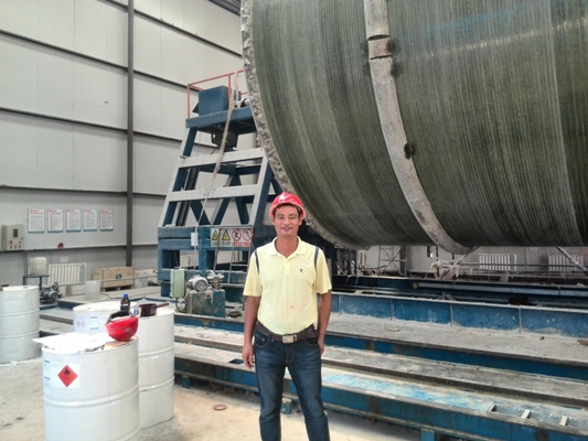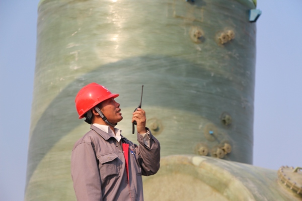 “張斯偉,你們班生產情況如何,有沒有人員中暑?”“報告熊經理,人員一切正常,保證下班前完成MK-09號罐體纏繞結束”纏繞班長張斯偉用手抹了一把臉上的汗水答道。 “范成雷,現場情況如何,今晚能否完成1號平臺的法蘭對接?”“報告熊經理,人員一切正常,保證今晚保質保量的完成任務”,手糊二班范成磊回答道。像這樣的詢問和關心還有很多很多,不管是在室溫高達四十二度的纏繞車間還是在六十二米高的玻璃鋼煙囪手糊對接處,你都能看到虎山項目部經理熊國慶的身影。