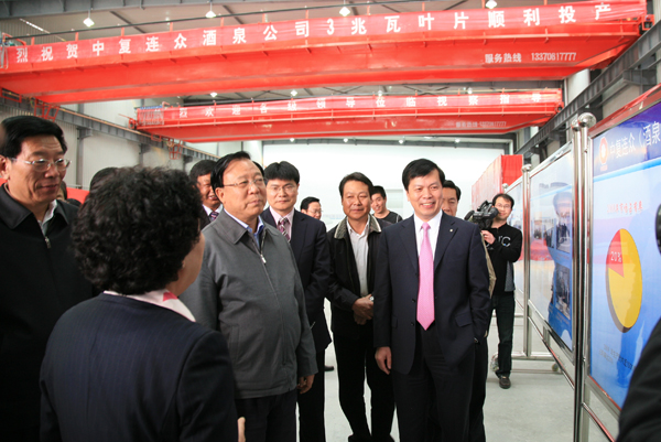 2010年5月12日,酒泉國家風電裝備高新技術產業化基地正式掛牌,標志著甘肅新能源基地建設進入了一個新的階段。甘肅省委書記、省人大常委會主任陸浩出席掛牌儀式并為基地揭牌,省委副書記、省長徐守盛也參加了儀式。隨后陸浩、徐守盛在中國復合材料集團有限公司董事長兼總經理張定金的陪同下視察了中復連眾酒泉葉片基地。