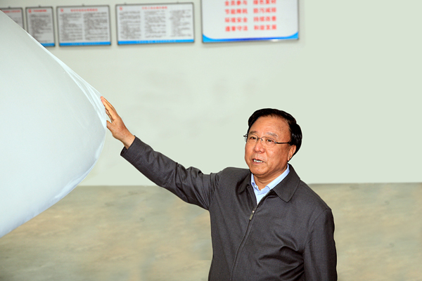 隨后,陸浩、徐守盛等各位領導和嘉賓相繼視察了包括中復、華銳、金風科技的幾個酒泉產業化基地的風電企業。在來到中國復材3兆瓦的葉片車間之后,陸浩認真聽取了張定金的介紹匯報,當看到中復生產的3兆瓦葉片時非常高興,并與其他領導和嘉賓一起出席中復3.0MW風力機葉片的投產儀式,中國復材副總經理、中復連眾集團董事長任桂芳、總經理喬光輝陪同參觀。