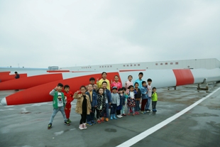 上午九點鐘,雖然天空飄著零星細雨,小朋友的熱情卻很高漲。大家統一乘坐大客車來到連云港葉片工廠,參觀一分廠、二分廠的辦公區域,葉片貨場,檢測中心和12兆瓦試驗臺。大人們平時司空見怪的風景,在小朋友充滿好奇的眼里,一切都變得不同。一只只巨大的銀色葉片,靜靜地躺在貨場上,像一架架等候起飛的飛機;12兆瓦試驗臺,兩只正在進行加載試驗的葉片,像一個巨大的變形金剛,抖動著翅膀,隨時準備變身。