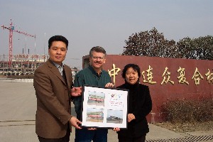 1 中復連眾董事長任桂芳女士、總經理喬光輝先生和CSPC南海項 目的催交經理 Clayton Miles先生在公司門前合影2 生產中的GRP管道3 CSPC南海項目首批GRP管道出廠4 CSPC南海項目首批GRP管道現場卸貨
