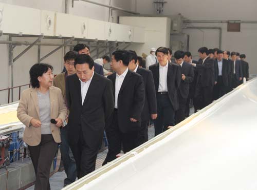 代表團隨后來到二分廠8號車間,一邊參觀一邊了解風力發電機生產工藝。代表團贊嘆中復連眾重視科技創新、重視人才培養的做法,也祝福中復連眾早日實現亞洲最大的風力發電機葉片生產基地的目標。