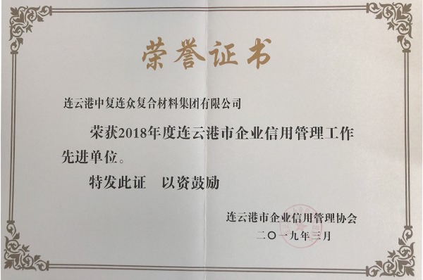 3月21日,連云港市企業信用管理協會對榮獲2018年度市級“信用管理先進單位”進行表彰并舉行授牌儀式,中復連眾榜上有名。