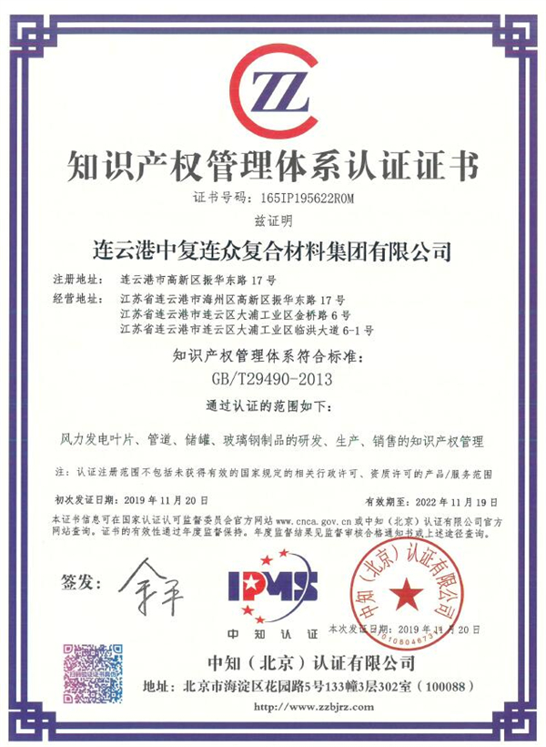 11月21日,中復連眾獲得由中知(北京)認證有限公司頒發的《知識產權管理體系認證證書》。該證書的獲得,標志著中復連眾知識產權管理符合《企業知識產權管理規范》標準要求,知識產權管理水平邁上新臺階。