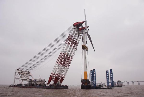 2010年2月27日15時28分,隨著最后一臺風機與海上基礎承臺對接,我國首座、也是亞洲首座大型海上風電場一一東海大橋海上風電場全部34臺風機安裝取得圓滿成功。這標志看我國海上風力發電產業穩穩邁出了第一步并進入了實戰階段。