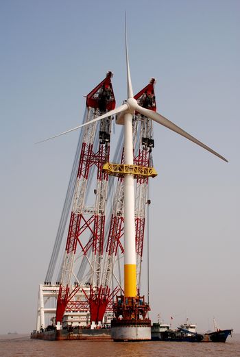 東海大橋風電場是由34臺國內單機功率最大的離岸型風電機組組成,總裝機容量10.2萬千瓦,設計年發電利用小時數2624小時,年上網電量2.67億千瓦時,項目總投資23.65億元。經過科學測量和論證,這個國內首創的海上風電場選址確定在位于上海東海大橋東側1一4公里、浦東新區岸線以南8—13公里的上海市海域。這里的平均水深為10米,海面以上的90米高度的年平均風速為每秒8.4米。2009年9月東海大橋風電場首批3臺機組起正式并網發電,東海大橋海上風電場在建設中,實現了兩個"首創":